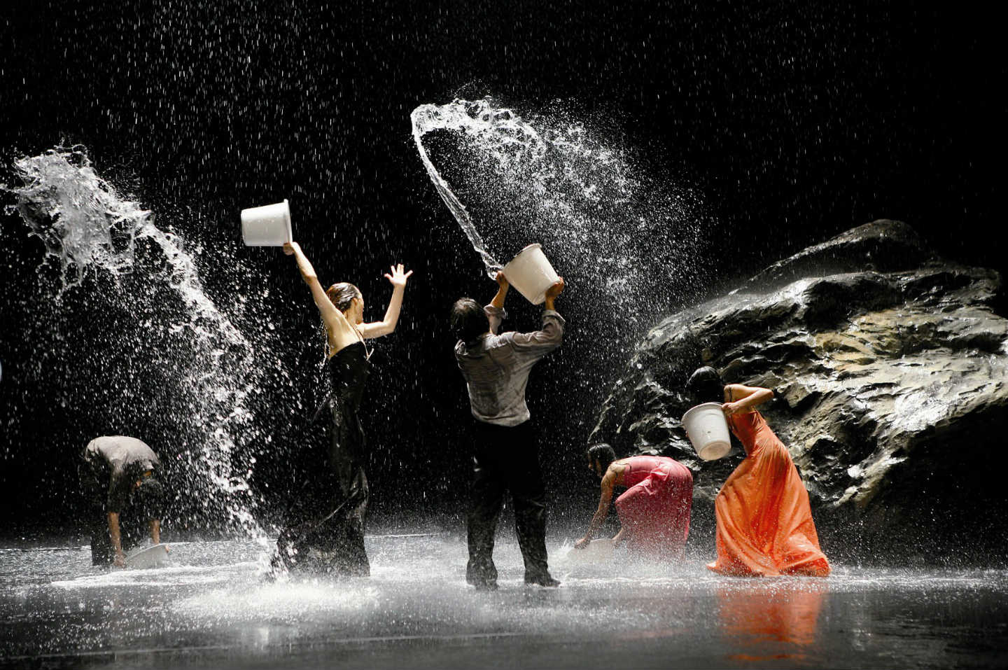 La Compagnia di Pina Bausch danza – inondandolo – su un tappeto di PVC nero.