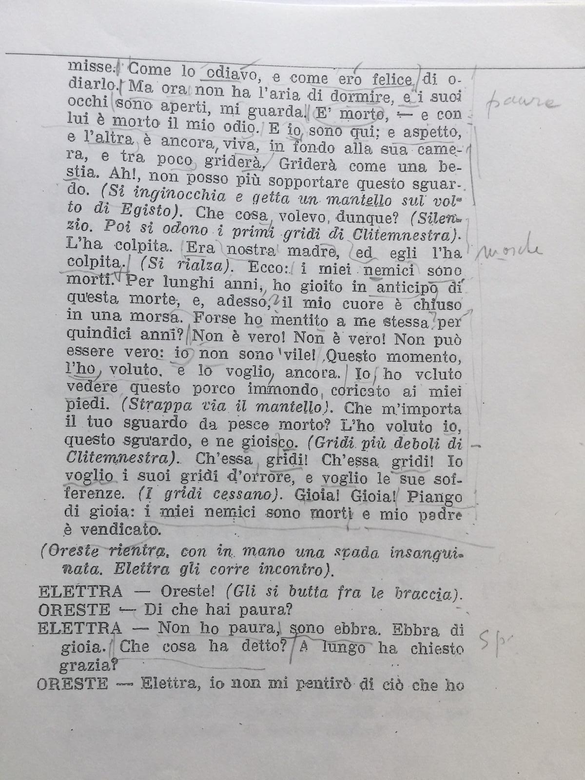 Pagina del copione Le mosche con gli appunti di Luca Ronconi