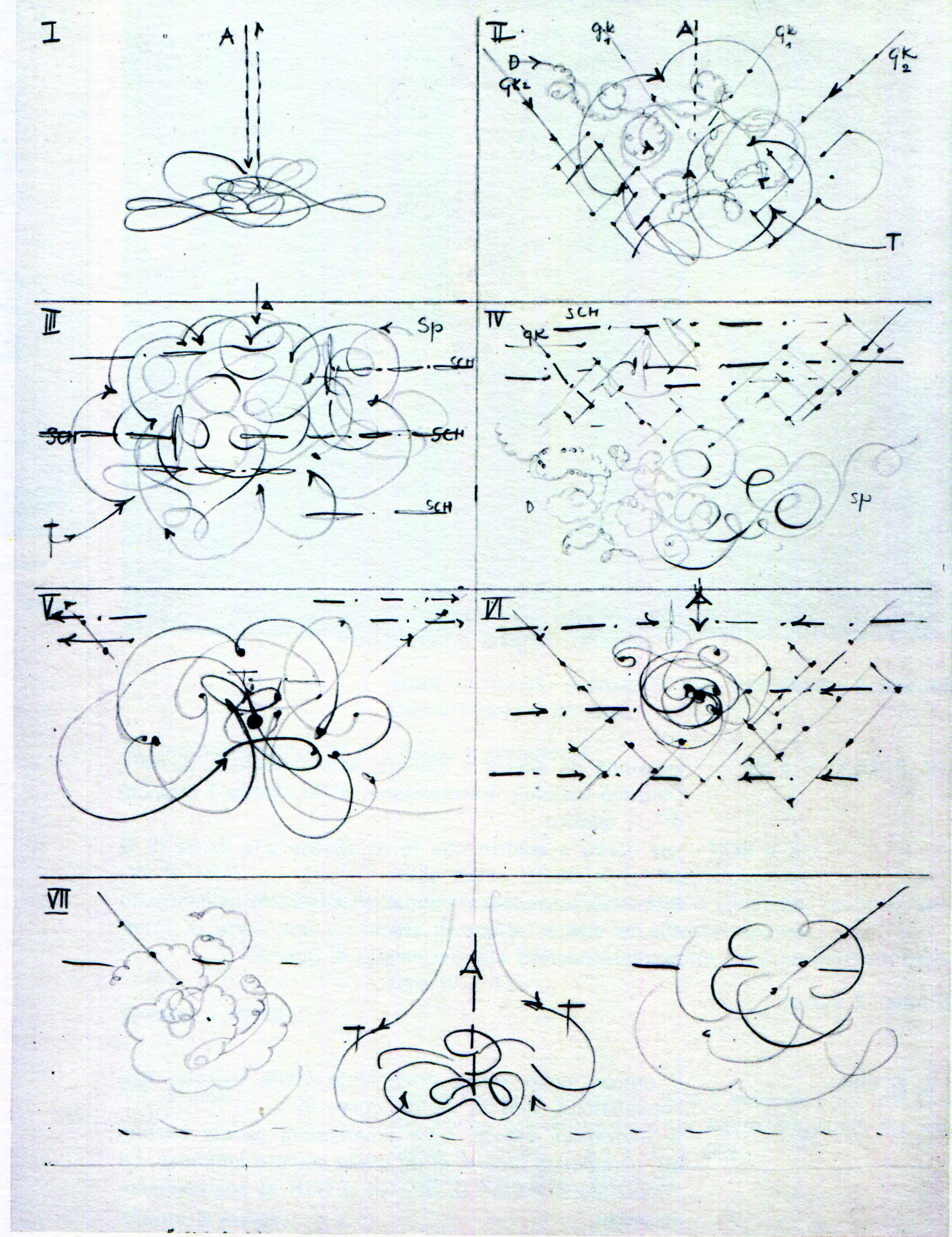 Balletto triadico. Versione per il varietà, 1936 Fogli 1-6. Matita e matita colorata. Proprietà Teatro Oskar Schlemmer (Collezione UJS) [Cat. N. 94 a-b-c-d-e-f-g]