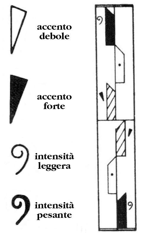 A sinistra: i simboli degli accenti e dell’intensità della tensione (immagine elaborata da Demy Giustarini). A destra: rigo cinetografico che mostra come vengono utilizzati questi simboli (immagine tratta dal volume di R. Laban, L’arte del movimento, a cura di Eugenia Casini Ropa e Silvia Salvagno, Ephemeria, Macerata 1999, p. 47).