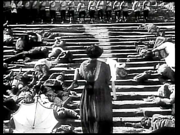 Qui il conflitto di numero è riportato, con effetto di potente amplificazione emotiva, all'interno dell'inquadratura contrapponendo alla madre, sola e inerme, l'intero plotone schierato contro di lei. Da La corazzata Potemkin di Ejzenštejn.