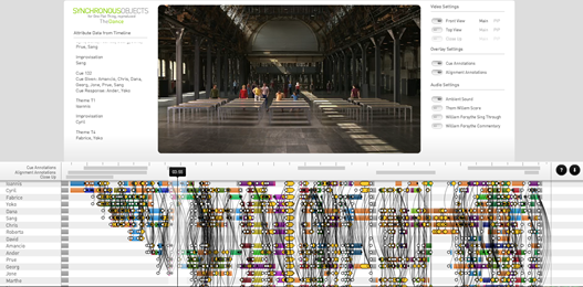 Dance score for One Flat Thing Reproduced. Osserva sulla sinistra i dati che scorrono nella linea temporale; al centro sono visibili circa 16 minuti di coreografia; sulla destra un video setting che ti consente di visualizzare l’oggetto coreografico da più punti di vista; un overlay setting e un audio setting. Nella parte sottostante puoi accedere alla timeline.